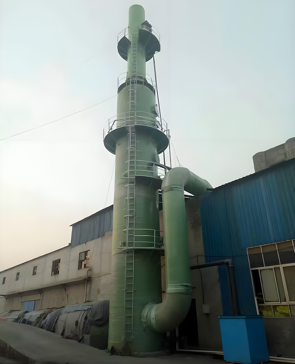 1. 塔体:FRP 一体缠绕 / 分段法兰连接,含进出口、人孔、爬梯、平台;内衬耐蚀树脂层,结构层保证强度。